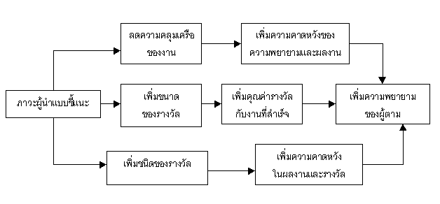 "ผู้นำควรสร้างแรงจูงใจให้แก่ผู้ใต้บังคับบัญชาโดยการเพิ่มค่าตอบแทน ที่มีคุณค่าเป็นรางวัลที่เขาสามารถทำงานได้สำเร็จ ตามเป้าหมาย และ ควรช่วยให้หนทางสู่ความสำเร็จนี้ง่ายพอที่จะพยายามเดินไป โดยช่วยลดอุปสรรคและแก้ปัญหาของงาน นอกจากนั้นควรเพิ่มโอกาสให้ลูกน้องแต่ละคนได้มีโอกาสที่จะมีความพึงพอใจที่จะประสบความสำเร็จเช่นนี้ รวมทั้งผู้นำควรสร้างความพึงพอใจให้กับลูกน้อง โดยเฉพาะความพึงพอใจในตัวผู้นำ"